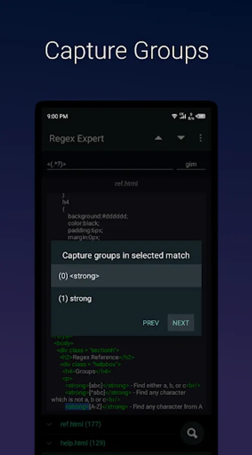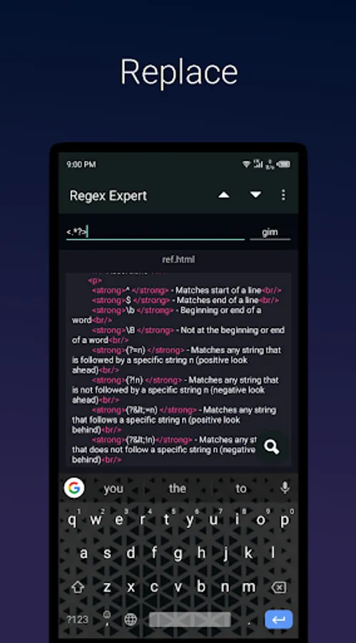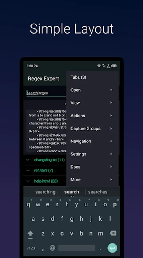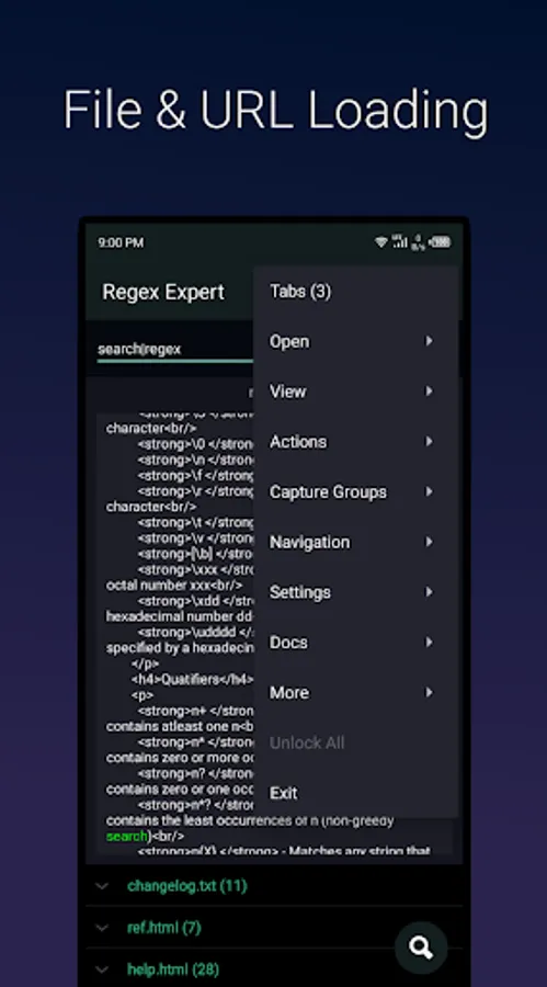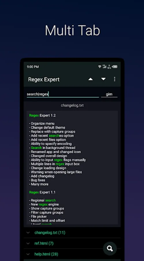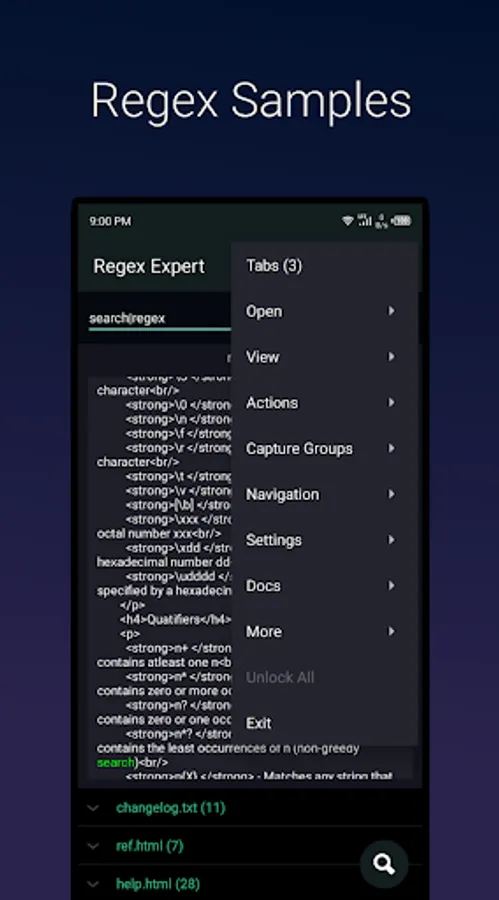 Regex Expert searcher is an app that use regular expressions to search across multiple text files. Can also be used as a regex tester, where you input some text and match against a pattern. This file searcher app also allows one to replace found matches in all files with a replacement text and save them in new files. RegEx searcher uses Java and JavaScript engine to perform search. Navigation is efficient in this file searcher app as one needs just to swipe in order to move to next or previous tab. It also has a unique feature called regional search with enables one to select only a potion of the text in file that is to be searched using regular expressions. It is also possible to filter some specific capture groups from being visible in the matches and also in replacement. Reg Ex search also enables one to save patterns for future use. Enable auto search to match regular expressions while you type. Regex search app for android also has a cheat sheet to look down metacharacters, modifiers and quantifiers.