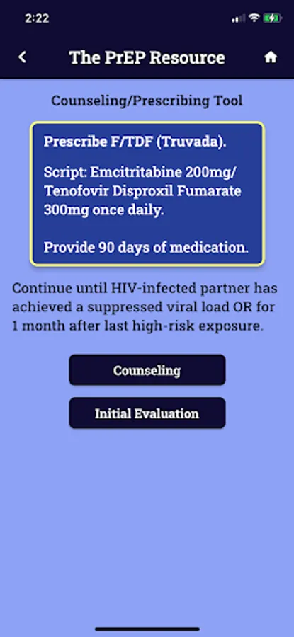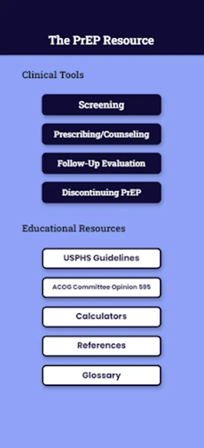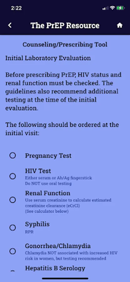 This app is a comprehensive, step-by-step guide to screening patients for appropriateness of using PrEP, choosing and prescribing a regimen, the initial and follow-up evaluations, and counseling patients on side effects, risk reduction, and effectiveness. The app also includes built-in calculators for estimated glomerular filtration rate and estimated creatinine clearance, which are important for determining which regimen is appropriate for your patient, as well as references and guidelines.
