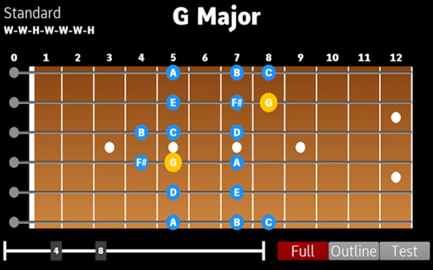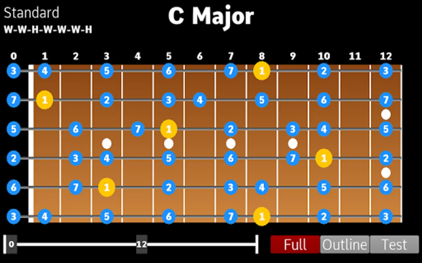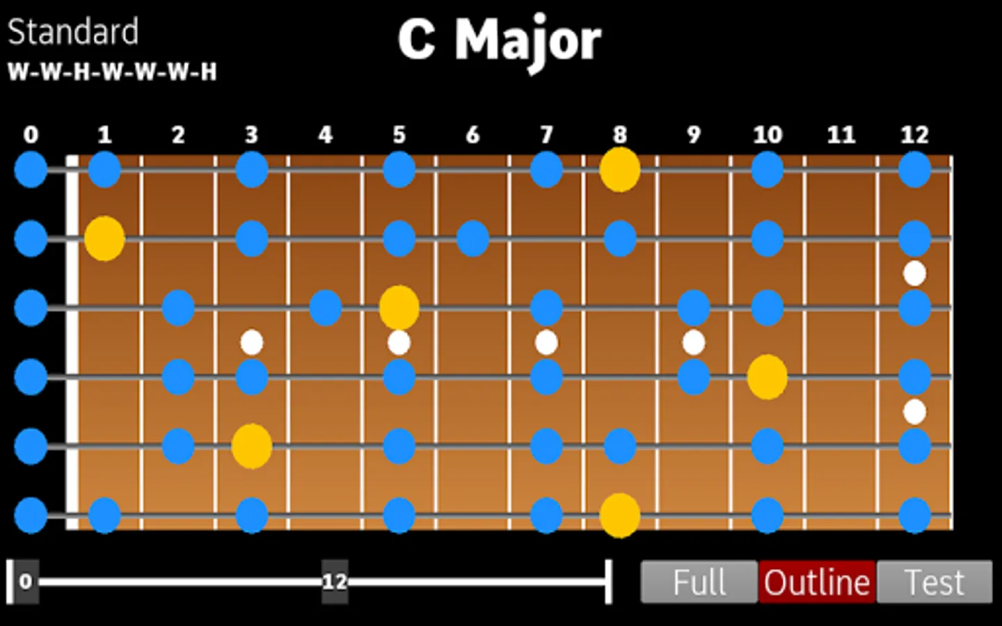 This interactive scale chart allows you to test your music scale knowledge. Toggle between the three disable modes. The full option shows all notes of the scale in either degree or note name notation. The outline options just shows the positions of the notes on the scale. The test option turns off all hints.