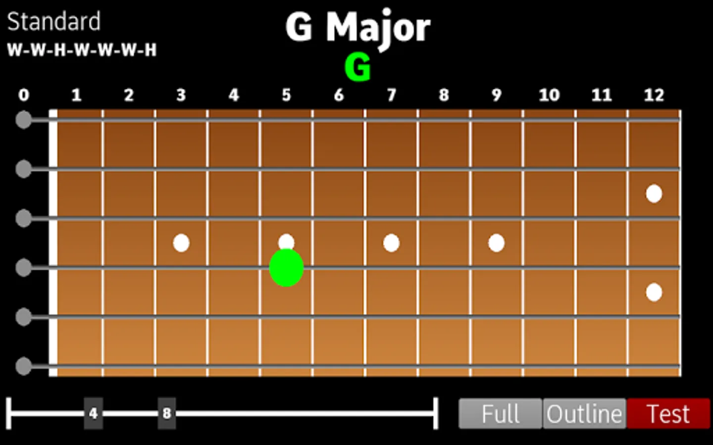 When pressing a note on the fretboard a green marker indicates that the selection was part of the scale. Red indicates a note was not part of the scale. The sliders at the bottom adjust the range of frets to focus on.