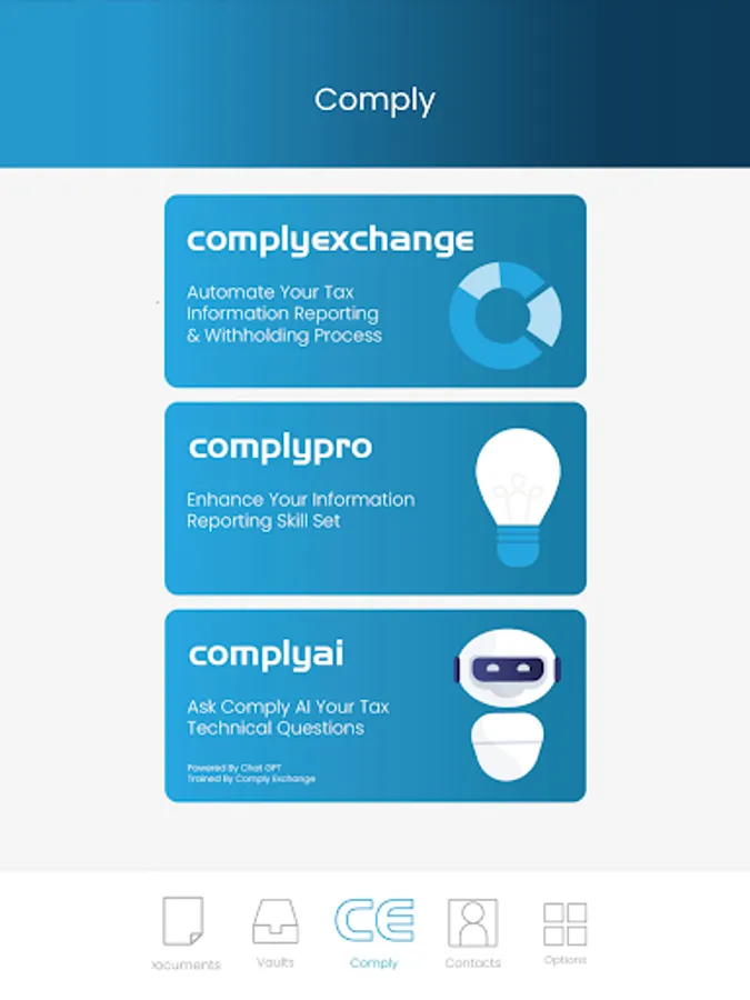The Comply Wallet is the latest addition to the Comply Exchange ecosystem and delivers secure storage for important tax documents and associated documentary evidence. Its purpose is to increase accessibility, mobility and provide tracking for users who must submit the same complex documents to multiple recipients. Requestors can invite, or the user can choose to send a wide range of documents through the Comply Wallet.