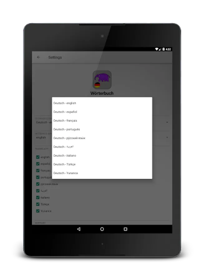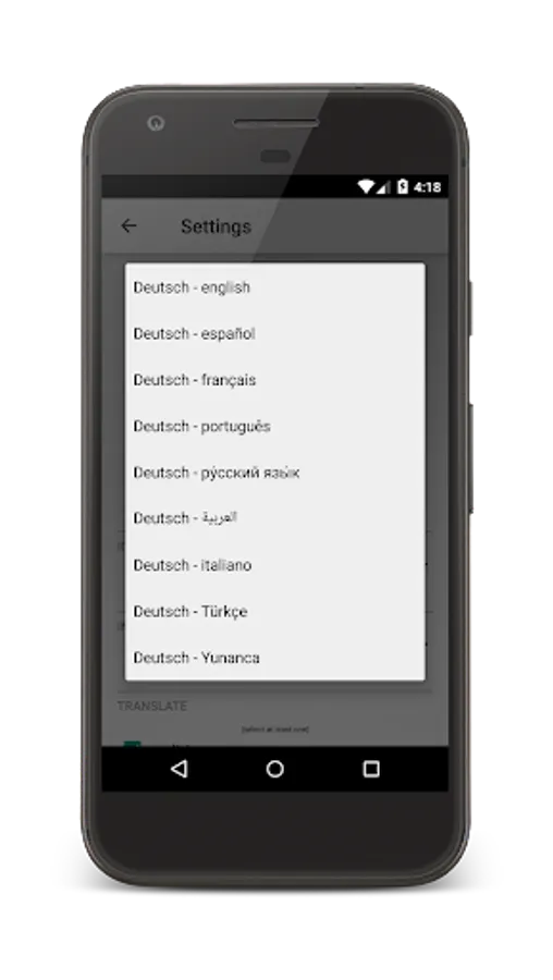◉ Language combinations: German ↔ English, German ↔ Spanish, German ↔ French, German ↔ Portuguese, German ↔ Russian, German ↔ Arabic, German ↔ Italian, German ↔ Turkish, German ↔ Greek