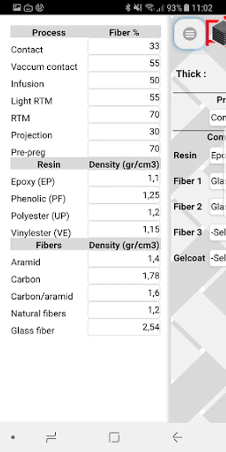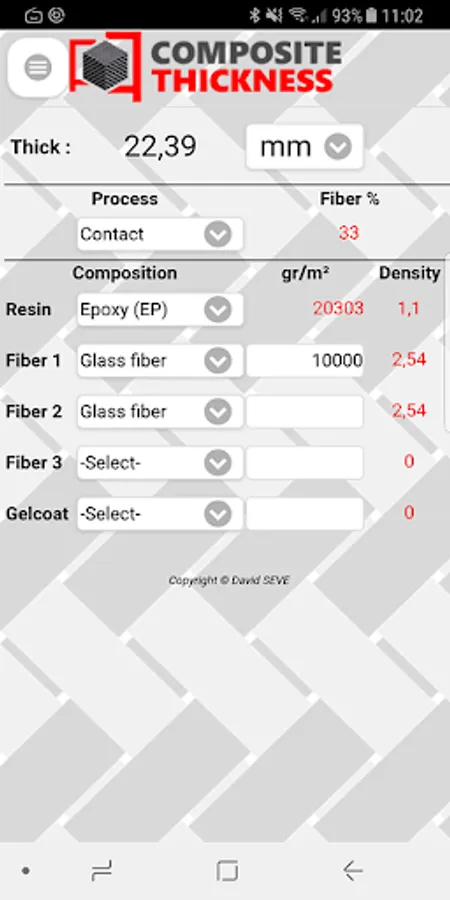Fill in the total weight per m² of each reinforcement and the type of resin, the application will automatically calculate the thickness of your monolithic composite.