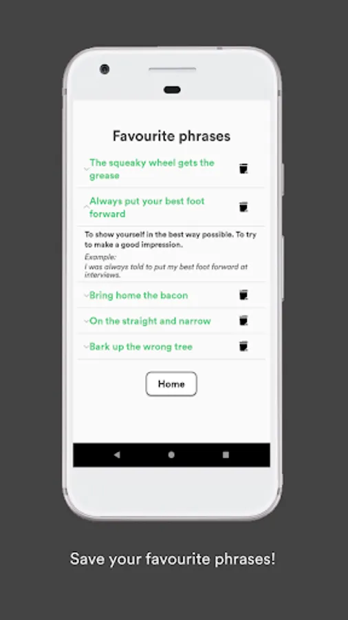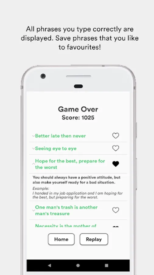 Each English sentence comes with a definition and example that you can view after the game has finished. Save the English phrases that you like to your favourites for future reference! This way, it is a fun and easy way to learn English phrases and idioms.
