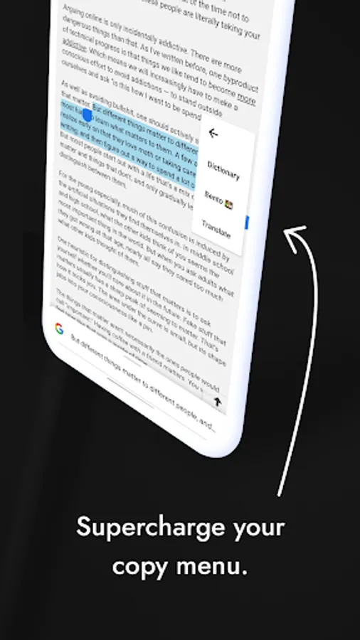 No more wasted time switching between apps while reading and taking notes. Just select the text you want and save it to Bento. Once you're doing reading, copy over all your snippets with a single tap.
