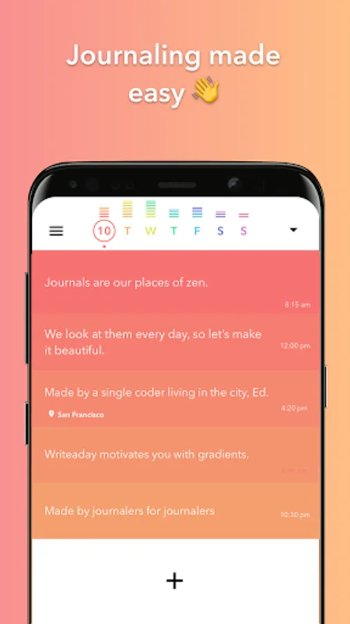 Developing the habit of journaling can be hard, but with Writeaday, it's easy. Our app offers bite-sized entries and a beautiful gradient design that grows as you write more. With no complex onboarding, overwhelming features, or noisy ads, Writeaday is a design-first journal that helps you focus on one thing: writing.