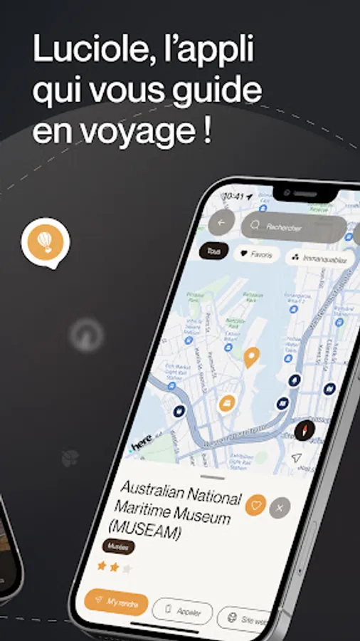 Luciole allows you to visualize the stages of the trip from the departure airport to the return airport. With all its good addresses and points of interest on board, you can calmly prepare your program day by day by preselecting the essentials according to your tastes and desires to then access them more quickly during the trip.