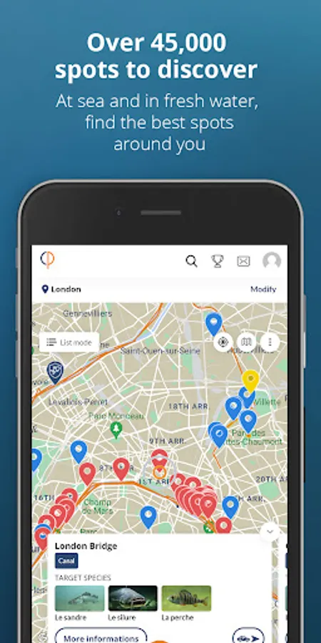 Our site gives access to more than hundred of thousand fishing spots in the word. Fishing on foot or by boat, save time to know where to fish right away. For each spot, we give you the GPS coordinates (wrecks, rocky plateaus, ...) as well as the species caught.
