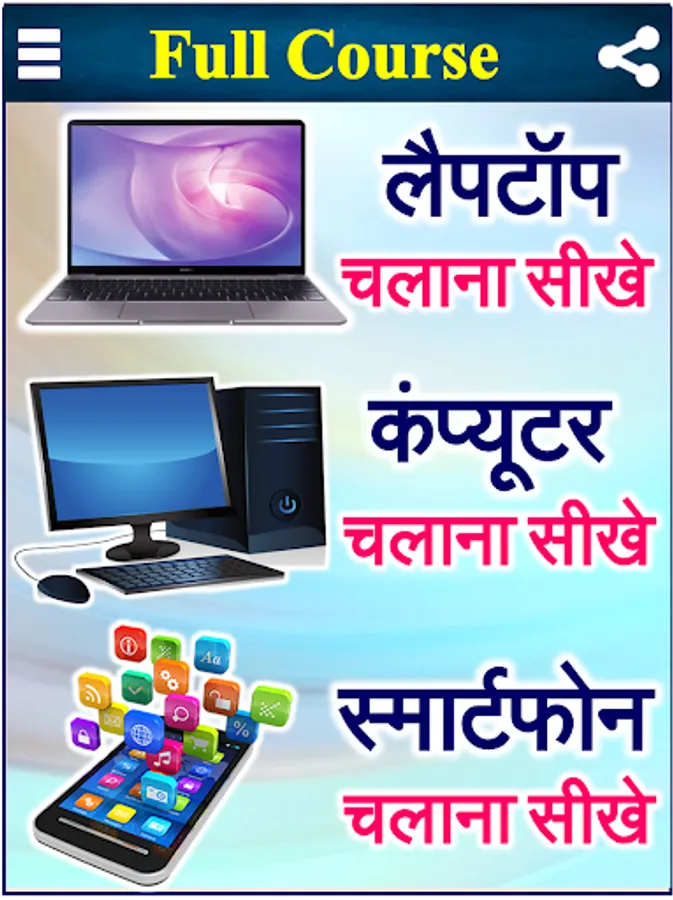 इस एप्प में आपको फुल कंप्यूटर कोर्स की जानकारी दी गयी है जिसमे आपको कंप्यूटर कोर्स से जुड़ी सभी जानकारी जैसे- बेसिक एंड एडवांस फुल कम्प्यूटर कोर्स आदि दिए गए है. इस एप्प को आप ऑनलाइन के साथ ही ऑफलाइन भी इस्तेमाल कर सकते है.