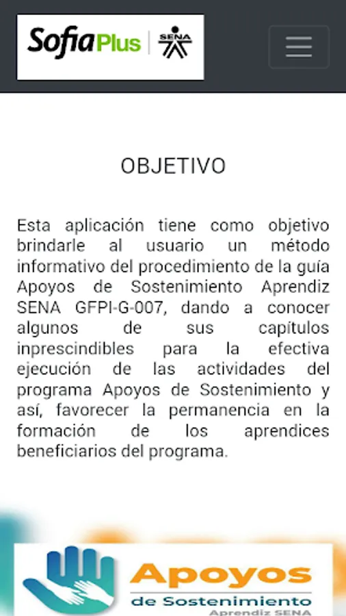 This application is directed to learners SENA, so that they have an informative method of procedure Support guide Sustain trainee GFPI-G-007, this application discloses some of the essential chapters Support guide Sustainment trainee for the effective implementation of activities Sustainment Support program and thus encourage retention in apprenticeship training program beneficiaries.
