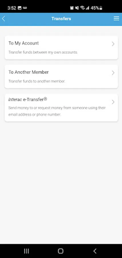 • Contacts – allows you to create new INTERAC® e-Transfer recipients by selecting from your device contacts.