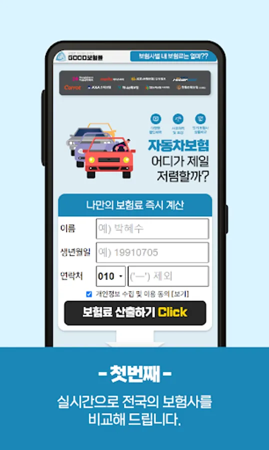 Download the Internet car insurance premium comparison real-time car insurance premium comparison quote site app and calculate your insurance premium in real time! From calculating auto insurance premiums to comparing products by insurance company, we will relieve you of the difficulties you face when signing up. It is not difficult to compare car insurance with a single smartphone application.
