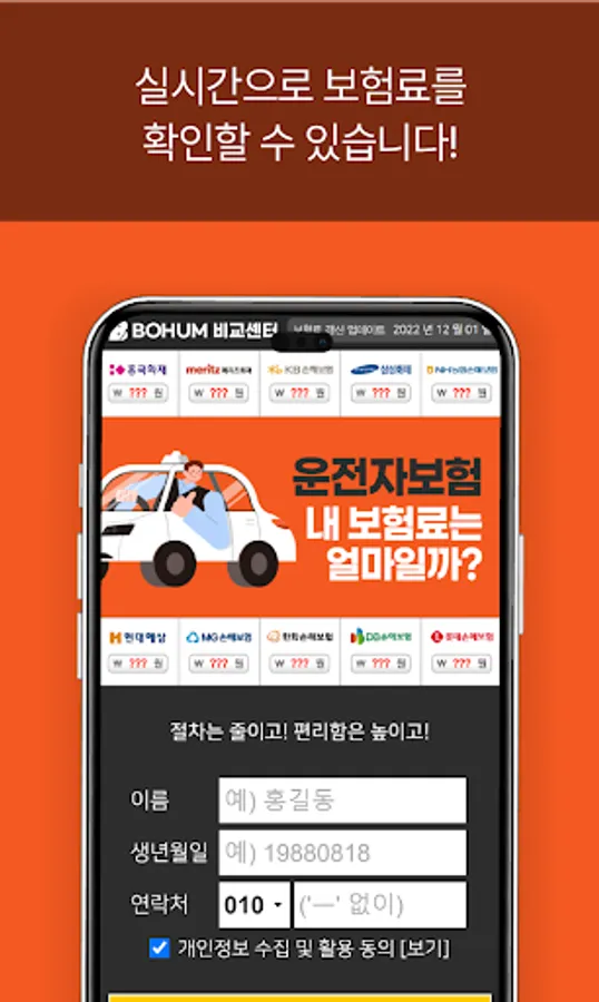 The driver insurance comparison quote app, which allows you to compare driver insurance premiums from major domestic insurance companies in real time and compare driver insurance coverage, provides direct assistance to driver insurance subscriptions. Choose the driver's insurance you need wisely for safe driving!