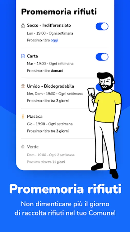 Thanks to this feature, you will never forget your door-to-door waste collection days. Set the days for garbage collection, the times you want to receive the reminder and activate the notifications. The app will send you a notification to remind you everything!