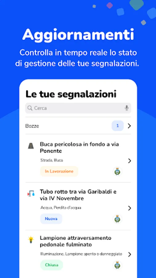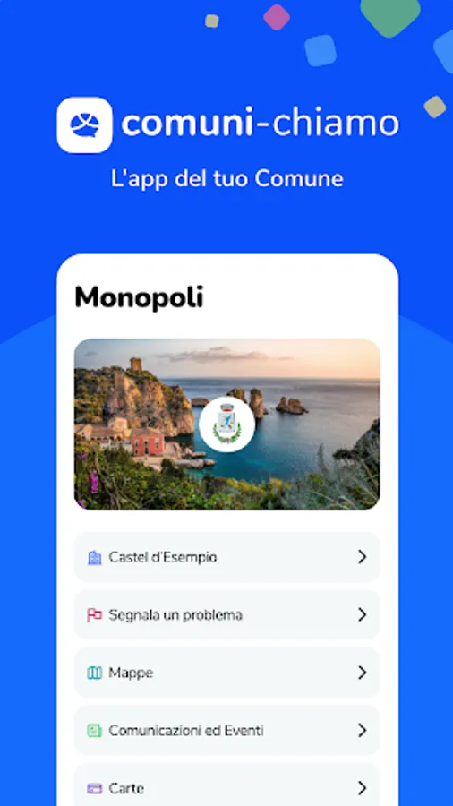Search for your Municipality, send your reports and receive updates on their management status. Find all the participating Municipalities on https://me.comuni-chiamo.com/entities