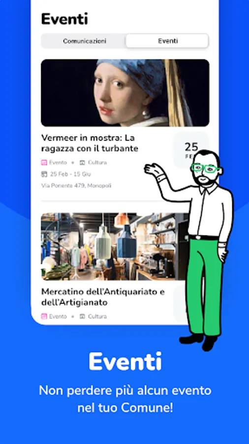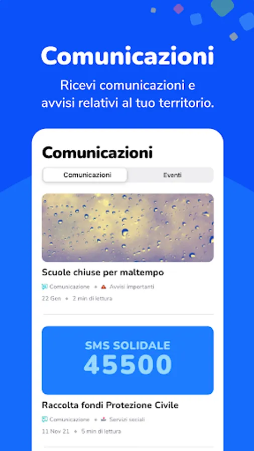 Read the notices and institutional news of your Municipality directly in the app. Enable notifications to receive communications wherever you are and make sure you don't miss anything important! Thanks to the app, you can also receive all the news relating to the events organized in your area.