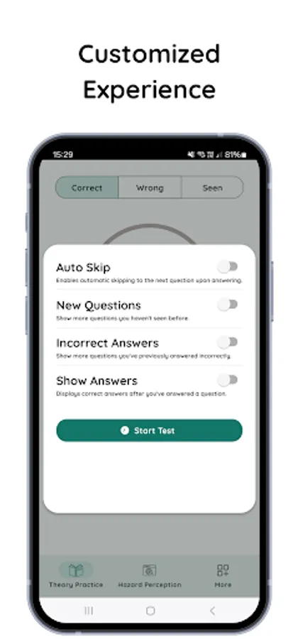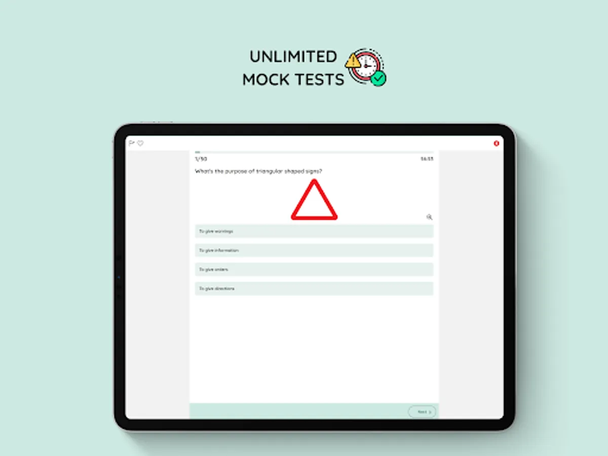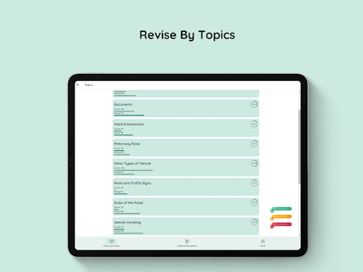 Enjoy a modern UI thatâs clean, intuitive, and easy to navigate. Whether youâre a teen or an adult returning to driving, the step-by-step layout guides you from basic practice to full mock exams without overwhelm. Quickly jump to categories (e.g., only road signs or only hazard clips) to focus your learning. Helpful tips are provided throughout, making your study stress-free.