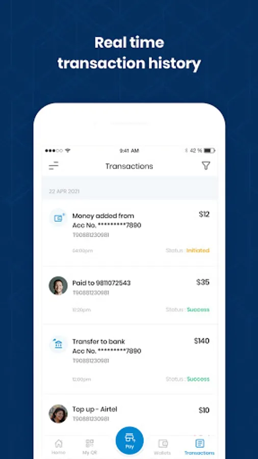 - Track all your transaction in one place hustle-free. A detailed view of all the transactions done using any payment instrument helps you reconcile easily. You can also apply filters to check for any specific transaction within the date range, by service type, and by instrument type as well.