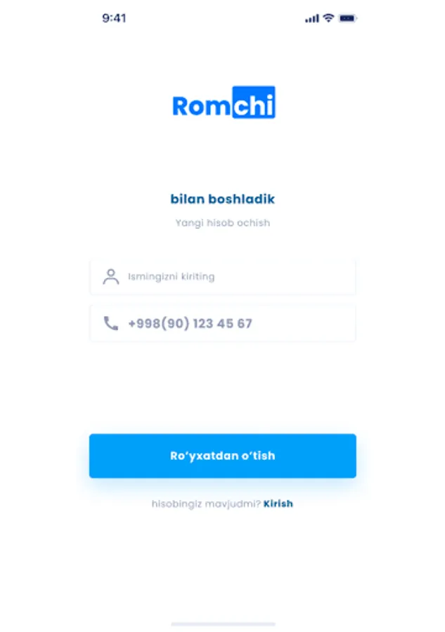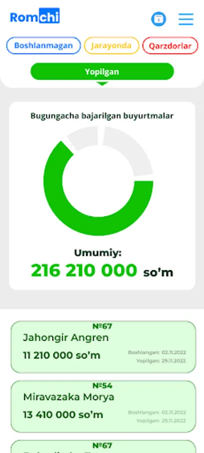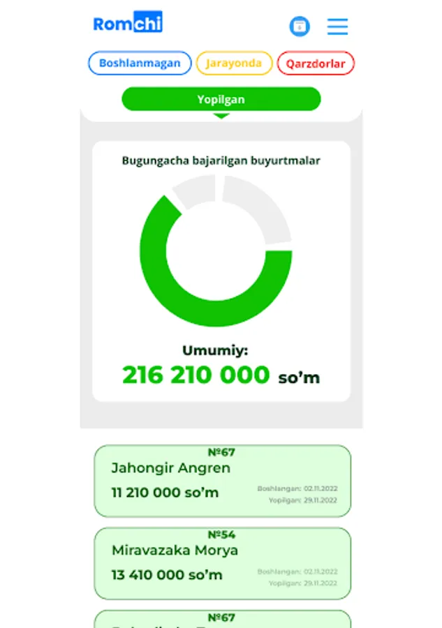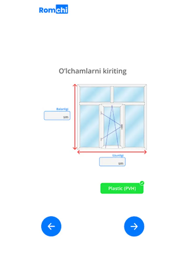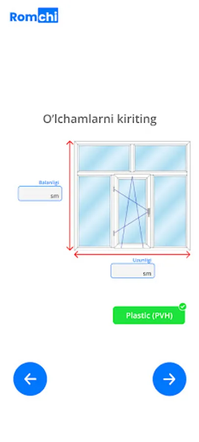 Romchi bu ustalar, biznesmenlar va ishchilarning tizimli tartibda harakat qilishi va ishlarini avtomatlashtirish uchun maxsus ilova, bu ilova yordamida ishchilarni boshqarish, eshik rom va fortochkalarning o'lchamlarini va hisob kitoblarini amalga oshirishingiz mumkin.