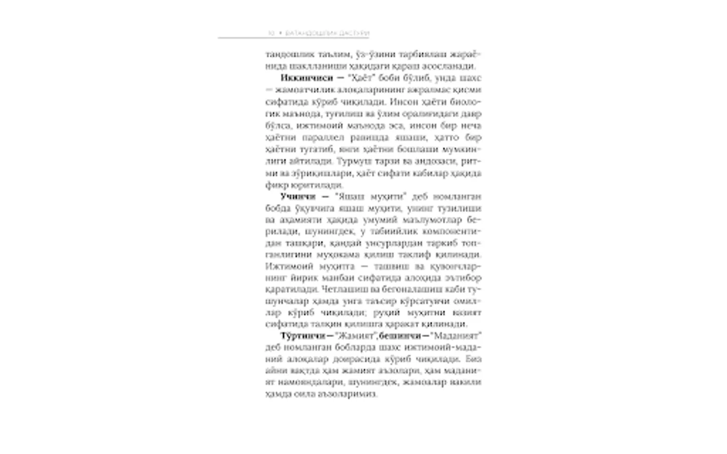 Asarda insoniyat oldida turgan muhim masalalar - inson, hayot, yashash muhiti, jamiyat, madaniyat, mehnat, rahbarlik, hamkorlik kabi mavzular o‘ziga xos tarzda batafsil yoritilgan.