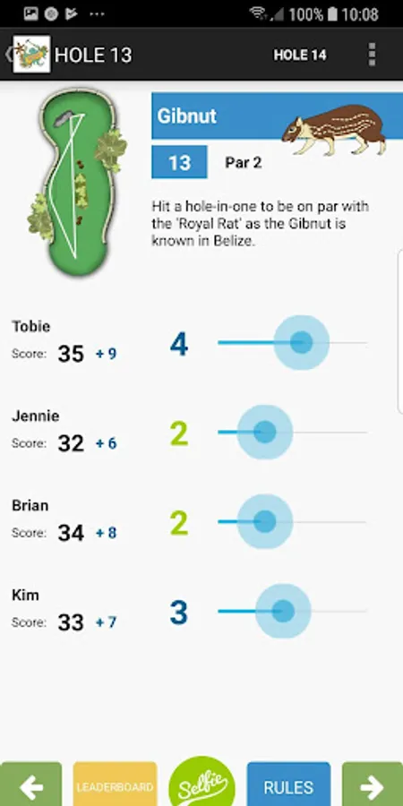 A mini golf scoring app for use at Inky's mini golf course at Sirenian Bay Resort, Belize . Use the app to record your own score and that of your friends as you navigate around the course. There are images of each hole and animations for the best route to take to use the slopes to your advantage. Learn more about the native animals in Belize as you navigate around the mini golf course. The app can keep a record of each round of golf you have played.