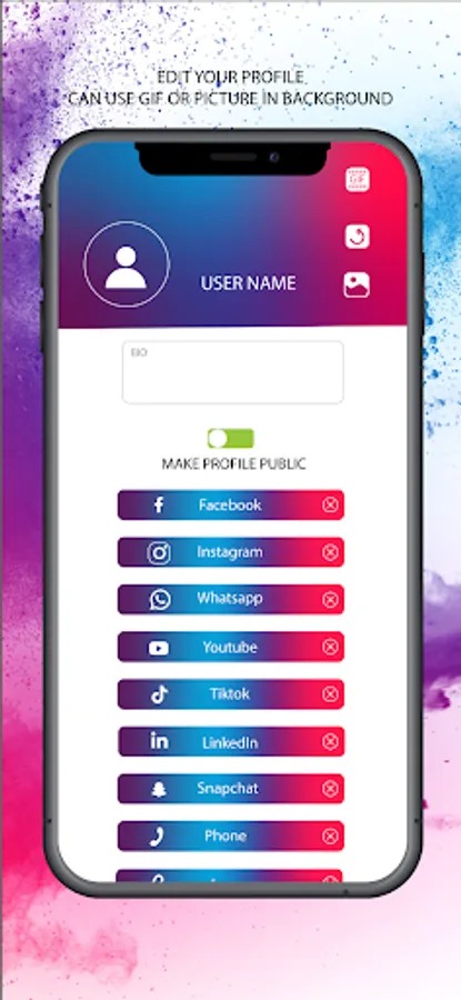 Linksdual will be able to provide the service of creating a modificable digital profile, the user can include a biography, photo of their profile, background (images or animated gif) editable button that the client can use to include their social networks etc. just one touch with NFC technology which will be complemented with a sticker or cell phone accessory that will have the technology included and can complete the operation of share your profile.