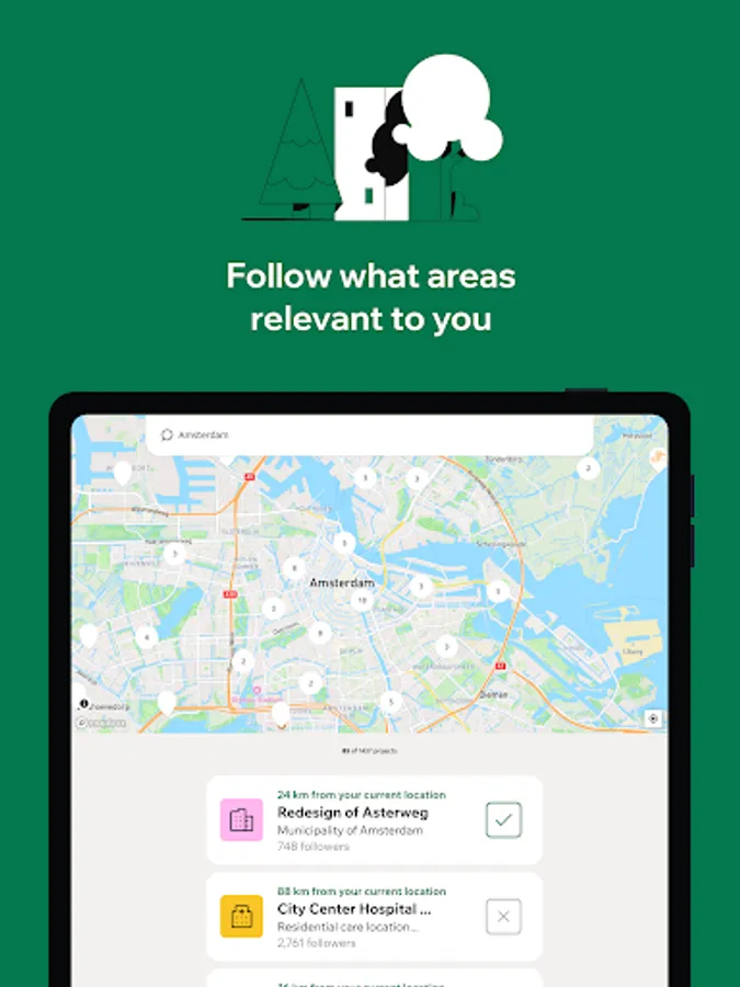 Use the interactive map or search by name, area, or organization to find projects close to you. Publiq gives you a clear overview of ongoing developments.