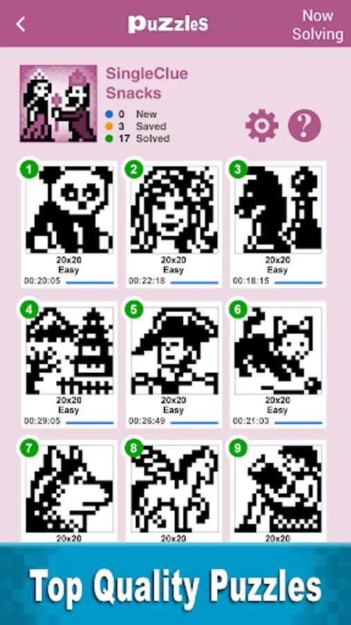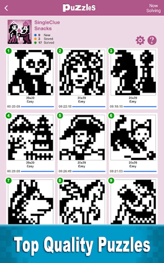 To help see the puzzle progress, graphic previews in the puzzle list show the progress of all puzzles in a volume as they are being solved. A Gallery view option provides these previews in a larger format.