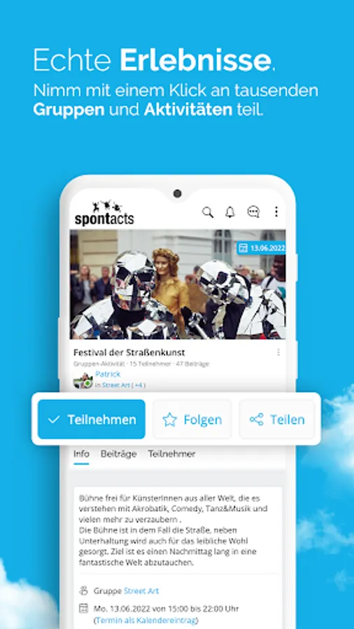 ✔️ Collaborative - Establish interest groups & use the Spontacts live chat or messenger to stay in touch with other people. Plan events together and find participants for your hobbies and leisure activities.