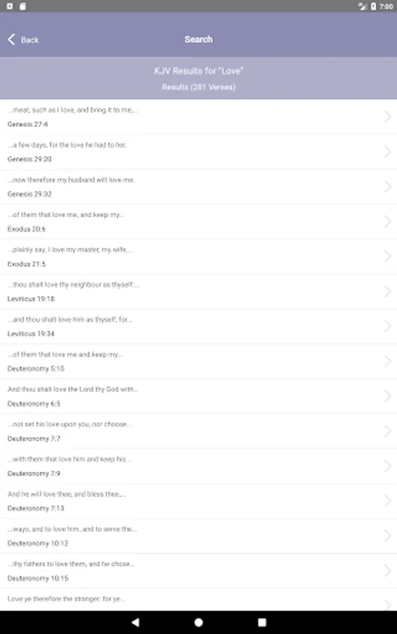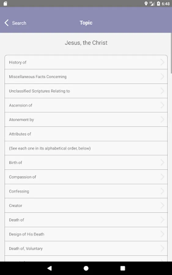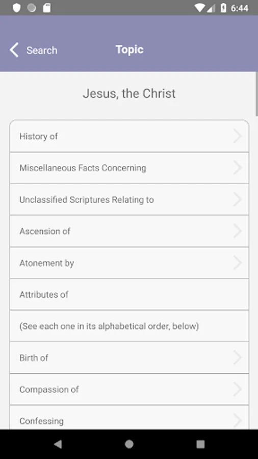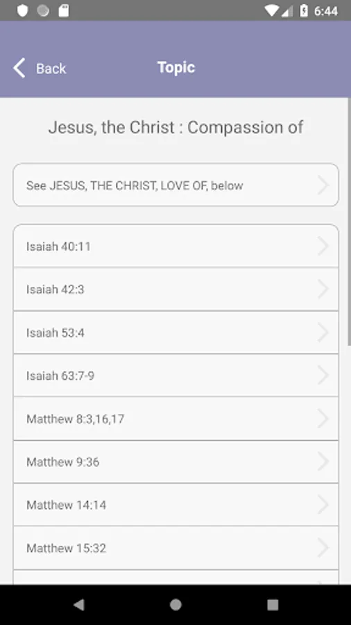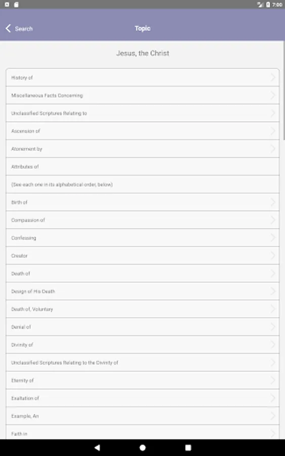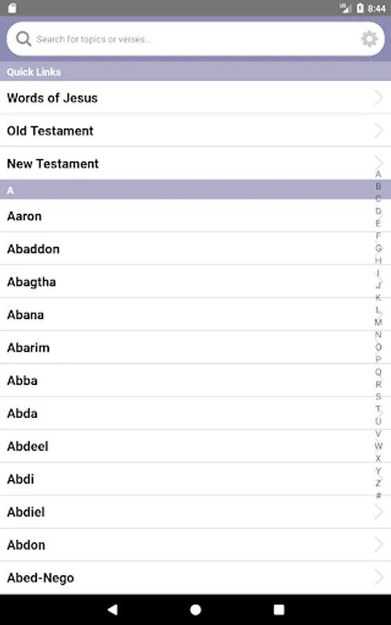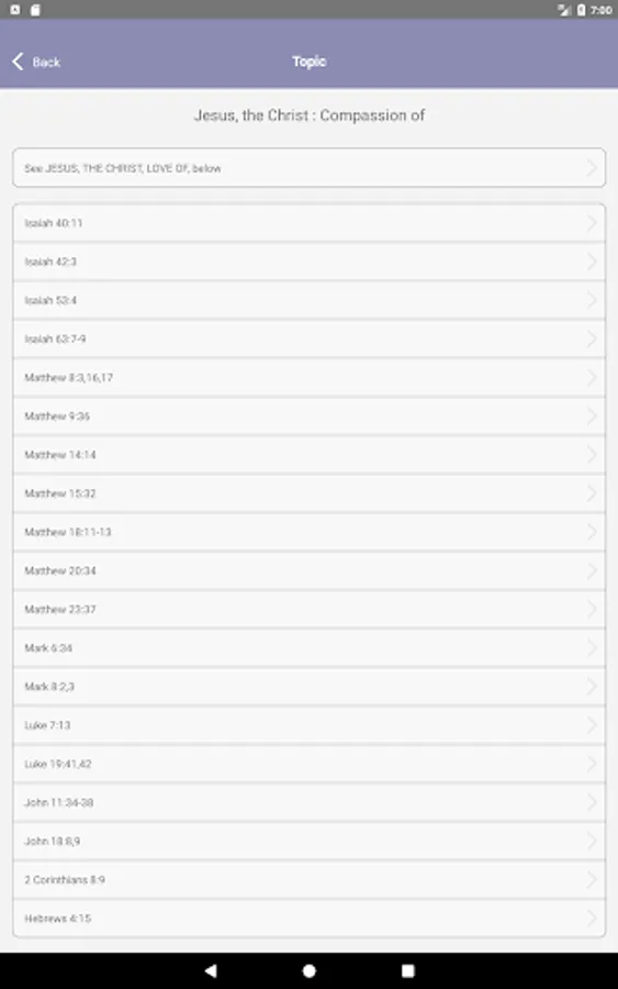 The Concordance app allows easy access to Bible topics. Based on the public domain Naves Topical Bible Concordance.