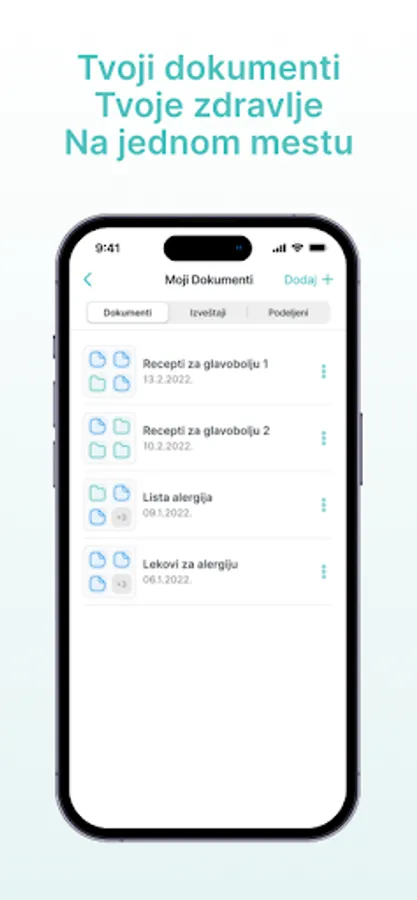 U aplikaciji imate mogućnost čuvanja zdravstvenih kartona (lekarski izveštaji, laboratorijski nalazi, recepti, terapije…) u elektronskom obliku koje se lako dele sa željenim lekarom. Prilikom posete lekaru, lekar šalje svoj izveštaj, recepte ili upute direktno u vašu aplikaciju i njih čuvate u svom telefonu bez mogućnosti da ih izgubite.