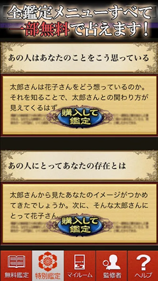 一度購入したメニューは、鑑定履歴以外からは再度課金が発生致しますのでご注意ください。