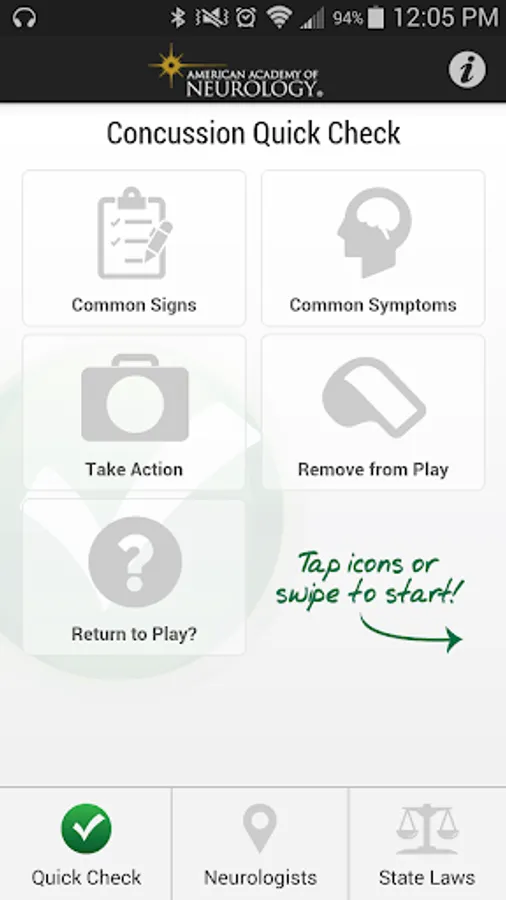 This App is provided by The American Academy of Neurology (AAN), the world’s largest association of neurologists, who is the trusted authority in managing sports concussion. The Concussion Quick Check App can help coaches, athletic trainers, doctors, parents and athletes quickly evaluate if someone may have a concussion, head or brain injury and needs to see a licensed health care provider, such as a neurologist, who is specialized in concussion.