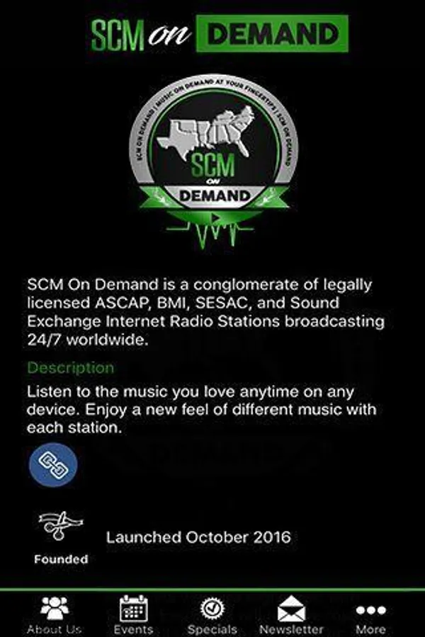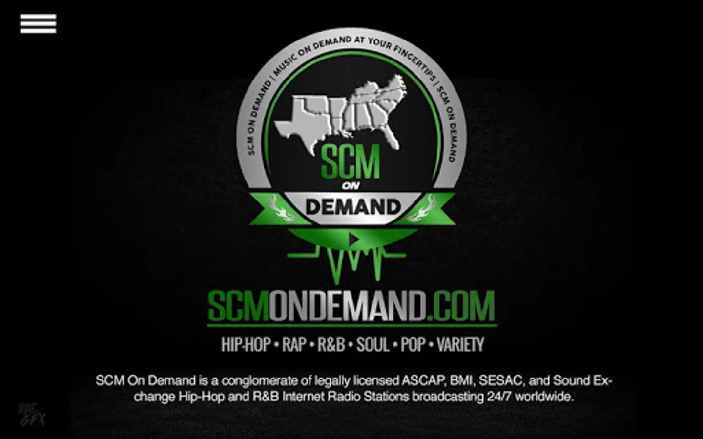 SCM On Demand is a conglomerate of legally licensed ASCAP, BMI, SESAC, and Sound Exchange Hip-Hop and R&B Internet Radio Stations broadcasting 24/7 worldwide.