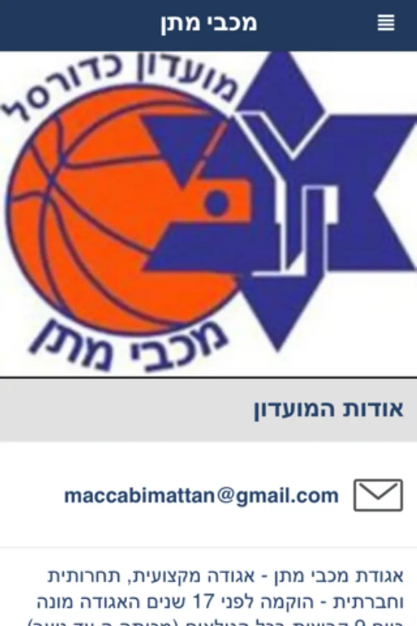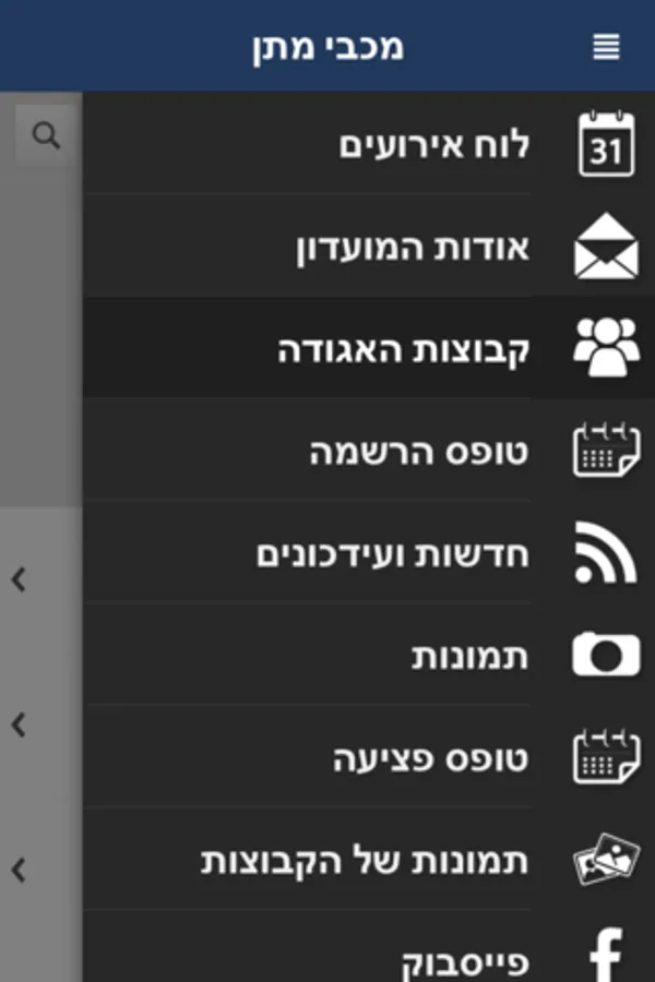 פייסבוק, תמונות, לוח אירועים, חדשות ועידכונים, טופס פציעה, אודות המועדון, צור קשר, מכבי ישראל, App for me, קבוצות האגודה, טופס הרשמה, LiveAlbum