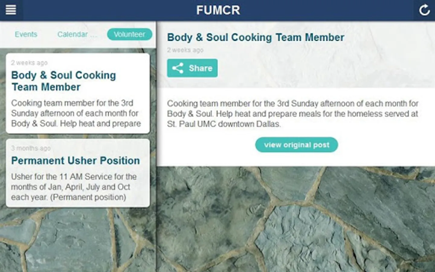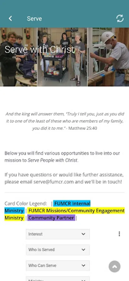 The FUMCR App offers easy access to church information, events & calendar, registration for study & service opportunities, caring ministry support, live stream of worship, recent sermons, photos, your online giving account, and FUMCR on social media. Visit us online at www.fumcr.com and www.accessfumcr.com.