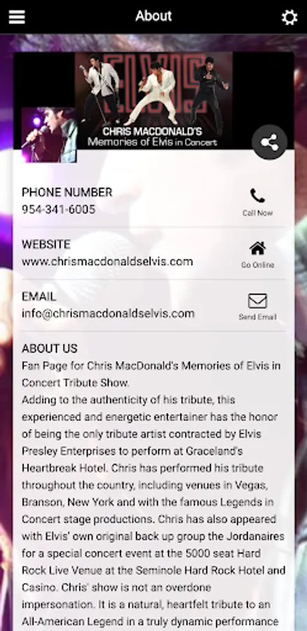 Concert dates,info,pics,videos and more of Chris MacDonald's Memories of Elvis in Concert tribute show.