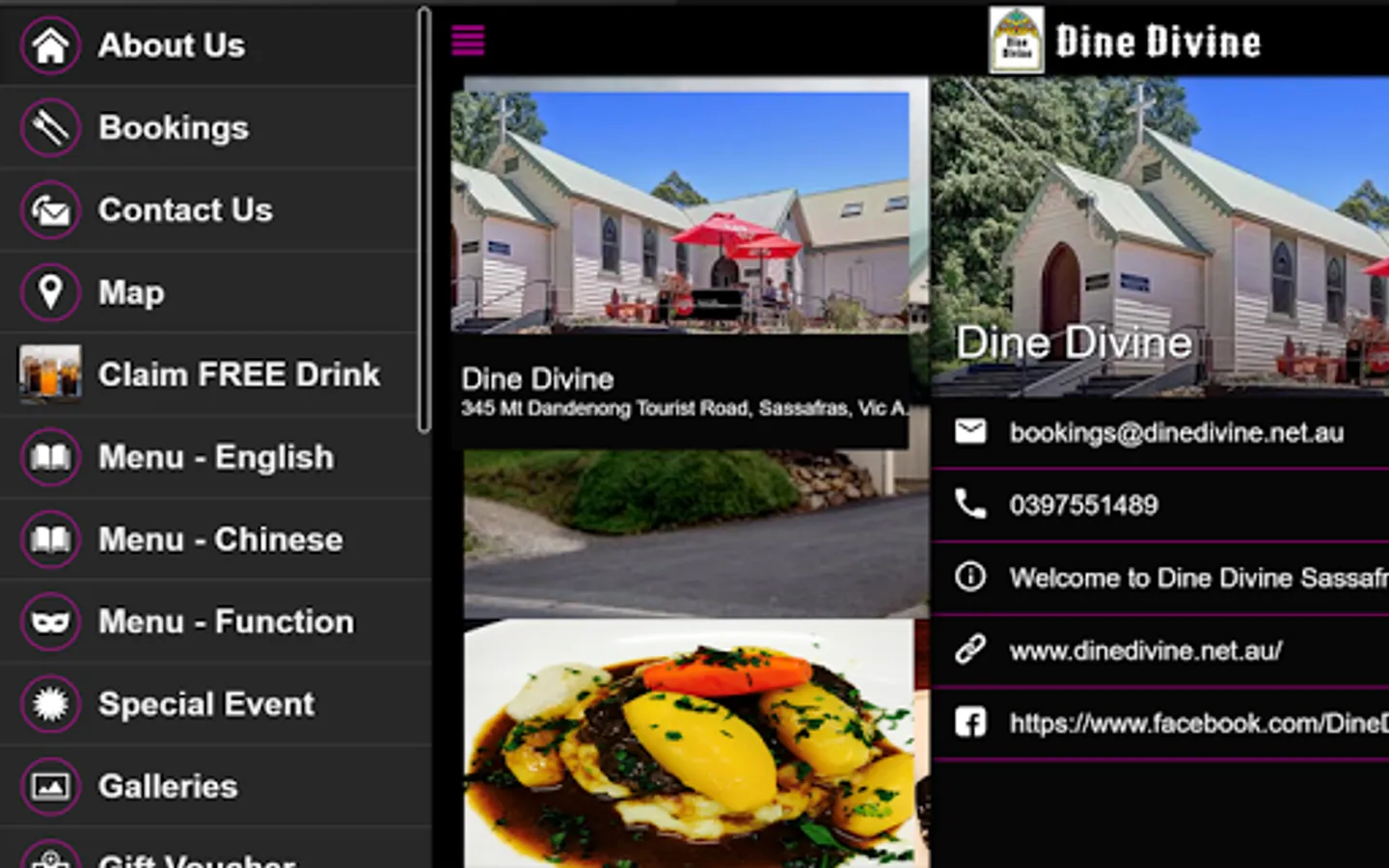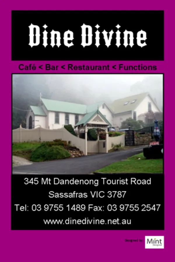 Welcome to Dine Divine Sassafras. We are a restaurant, situated at 345 Mt Dandenong Tourist Road, Sassafras, Victoria, now open for business with a wide variety of high-quality food and drink offered. Please feel free to check our menu while you're here, our trading hours are listed for your convenience. We look forward to you meeting our lovely, professional staff at our picturesque location.