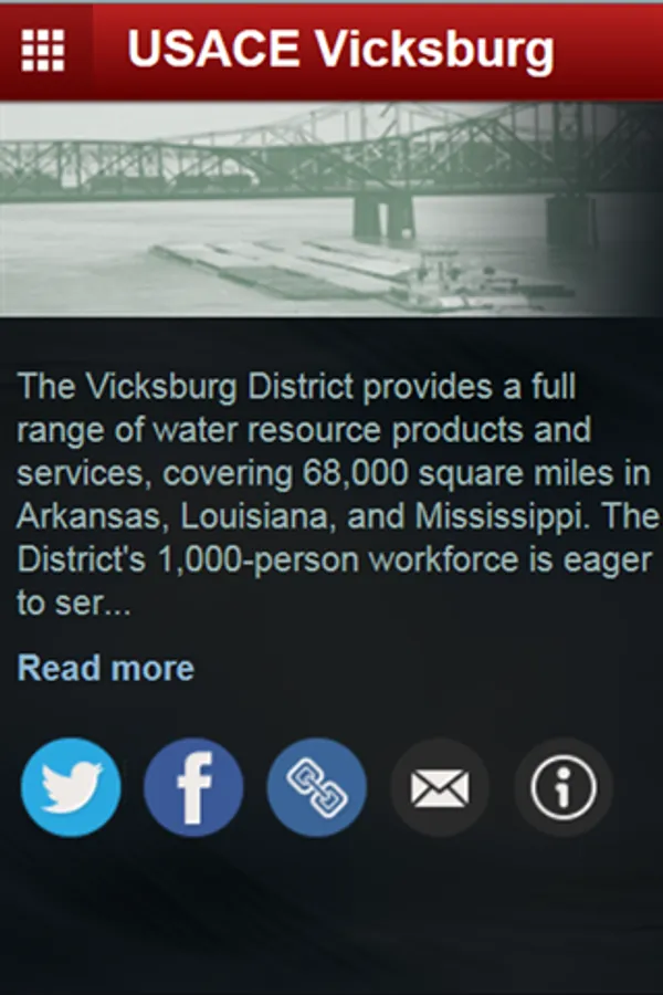 The Vicksburg District provides a full range of water resource products and services, covering 68,000 square miles in Arkansas, Louisiana, and Mississippi. The District's 1,000-person workforce is eager to serve you and to be the Engineer of Choice for the 21st Century.