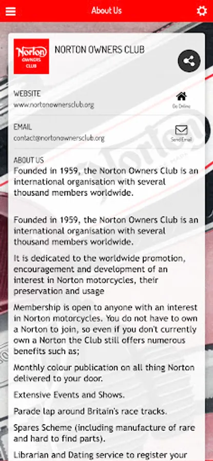 Membership: Showing you the many benefits of joining the Norton Owners Club, wherever you are in the world. There is a link to our website where you can join up. Members have access to our on-line forum, technical help for all Norton models, extensive spares including hard to get parts, 48pp colour magazine delivered to your door every month, library information, help with registering your Norton, track days, parade laps, free and discounted admission to some events and shows throughout the year and insurance discounts