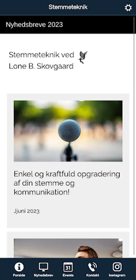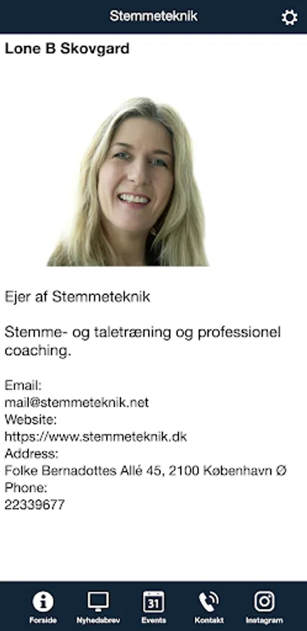 Voice and speech training, training in communication, professional and personal coaching. Ingredients include links to newsletters with simple and immediately usable voice techniques, film clips, tips for speech and breathing as well as contact information in Copenhagen.