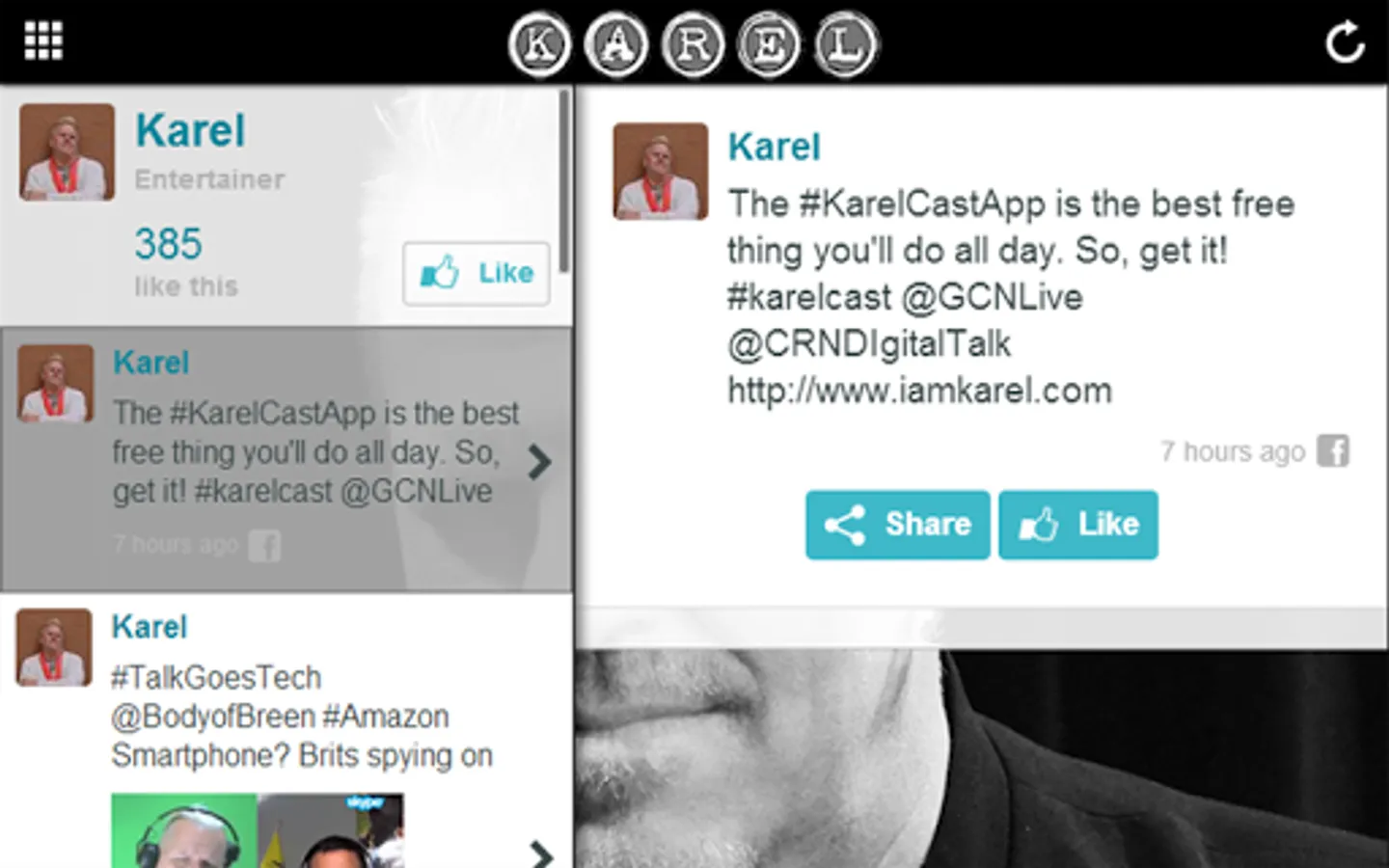 Iconic LGBTQ+ entertainer Karel is host to the tri-weekly Karel Cast, a 30-minute look at news and life from a unique—and outspoken—perspective (audio and video). Karel's show, available on iTunes, Spotify, Spreaker wherever one gets podcasts ranks among the top 200 most popular podcasts in countries across the globe, and is consistently in the top five on Progressive Voices Network on Soundcloud. A history-making radio show host in the 1990s at KFI AM 640 Los Angeles and 2000s at KGO AM 810 San Francisco, he has also written for the LGBTQ press since 1981, championing causes such as AIDS research and prevention and helping the homeless. In 2001, after his longtime companion and on-and-off air partner Andrew Howard died tragically, Karel made national headlines as he waged a battle to allow people in civil unions to have the same benefits—and the ability to sue for wrongful death—as married couples. He won at the appellate level, thus changing California’s Domestic Partner legislation. Today, he produces and hosts the bi-annual Dorians Toast awards specials for GALECA: The Society of LGBTQ Entertainment Critics, saluting the best of film and television. His reality-meets-talk show “Life In Segments” will air its fifth season on Free Speech TV in 2022. As a songwriter and recording artist, he is a voting member of The Recording Academy (GRAMMYs) and, as a busy presenter and more, a member of SAG/AFTRA. His one-man show, “Karel Stands Up,” has been a hot ticket up and down he West Coast, and after losing 110 lbs and becoming a planet-based eater, is working on his third book, “Die Healthy.” He writes regularly about politics and world issues at Medium (reallykarel.medium.com), while "The Karel Cast” app—downloaded in 18 countries—is free at all app stores. Visit reallykarel.com @reallykarel on social media, youtube.com/reallykarel and imdb.me/reallykarel
