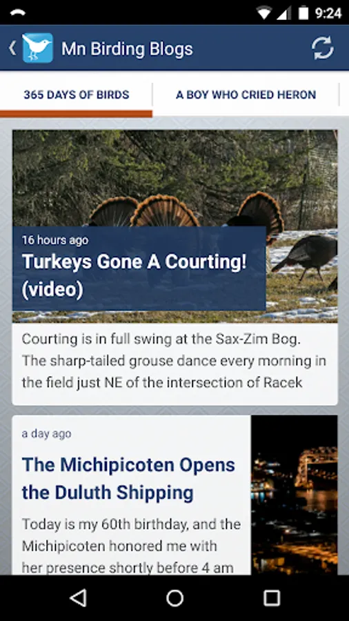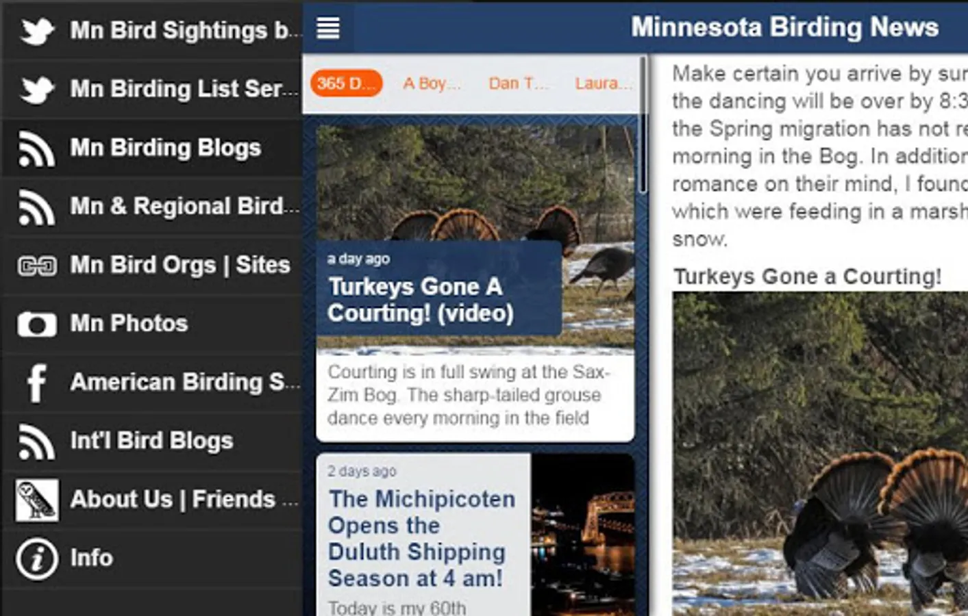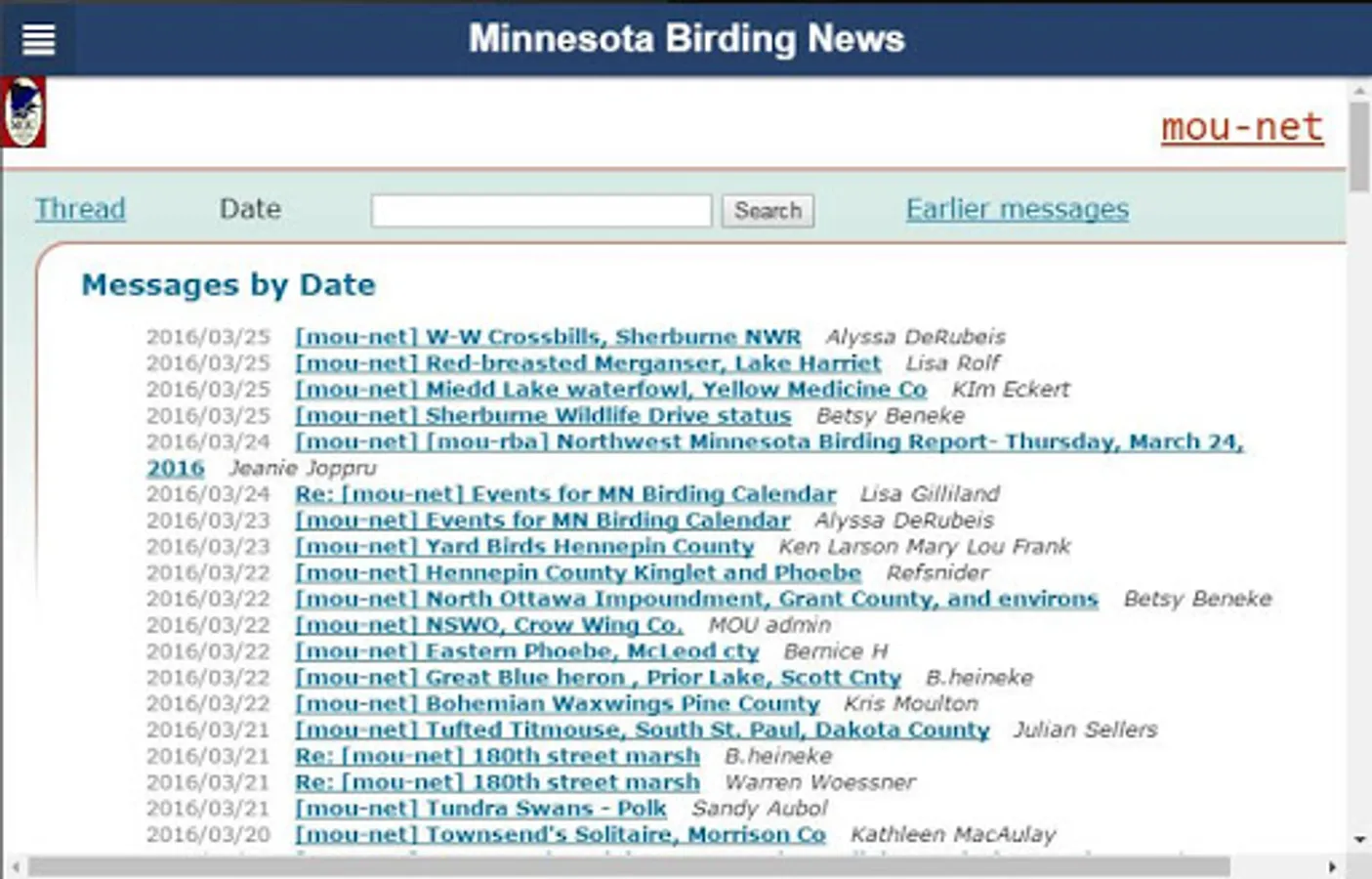 Provides access to latest Minnesota bird sightings from eBird and the Minnesota Ornithologists Union, the latest posts from bird blogs / organizations with a Minnesota focus, and a small number of American / international bird blogs.