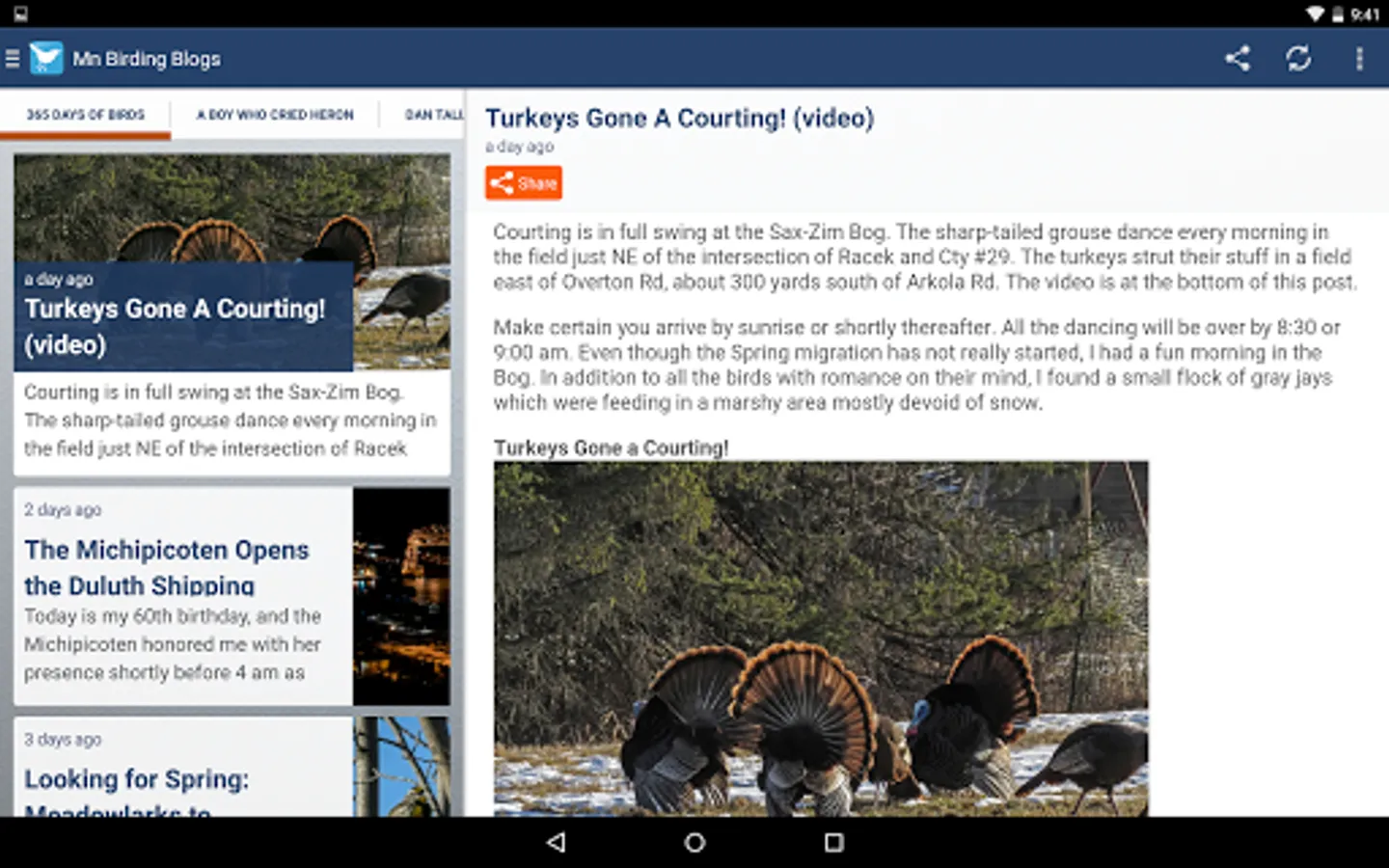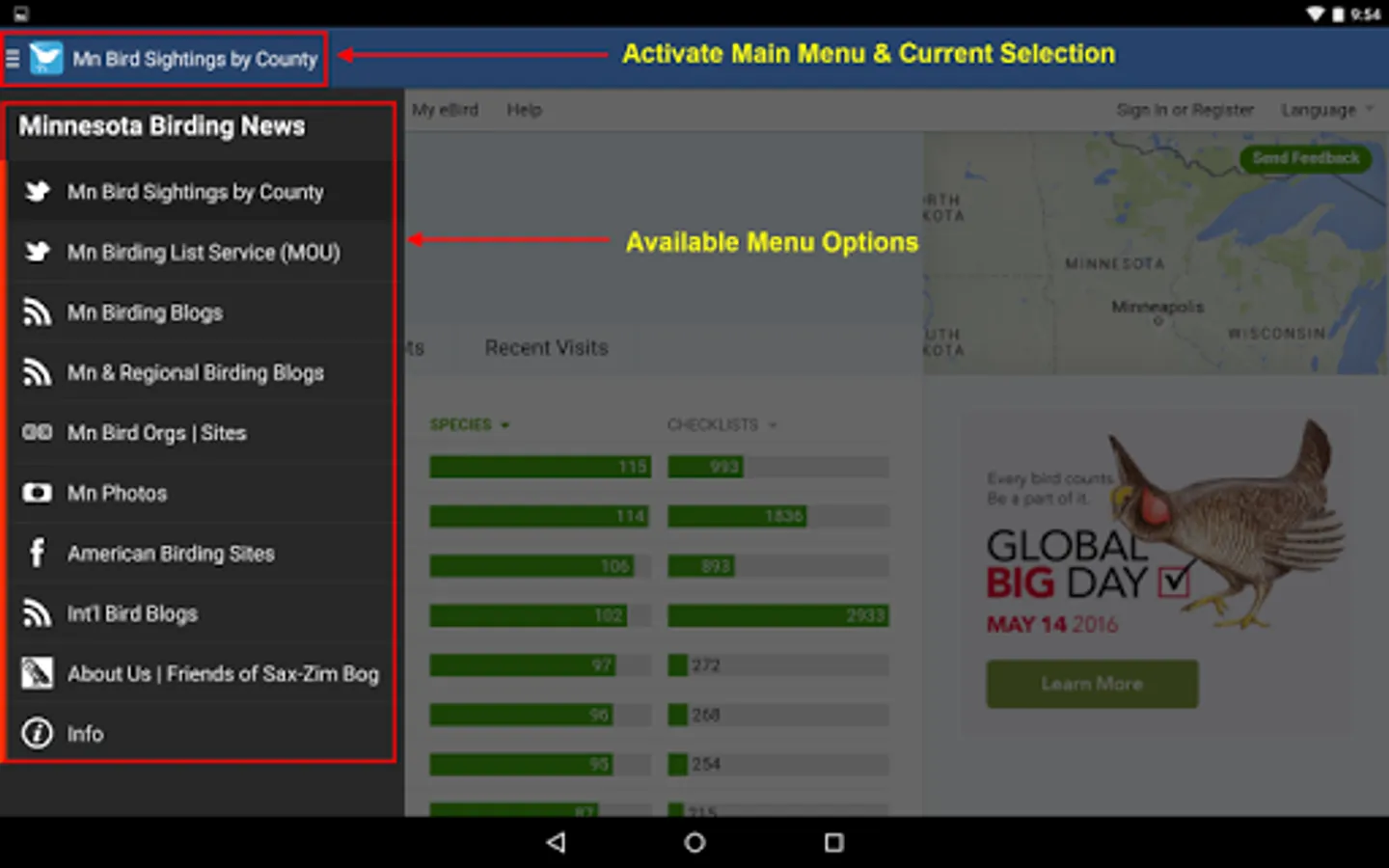 The developer of this app is a wildlife photographer and volunteer naturalist at the Sax-Zim Bog winter birding area. The Friends of Sax-Zim Bog sponsor this app.