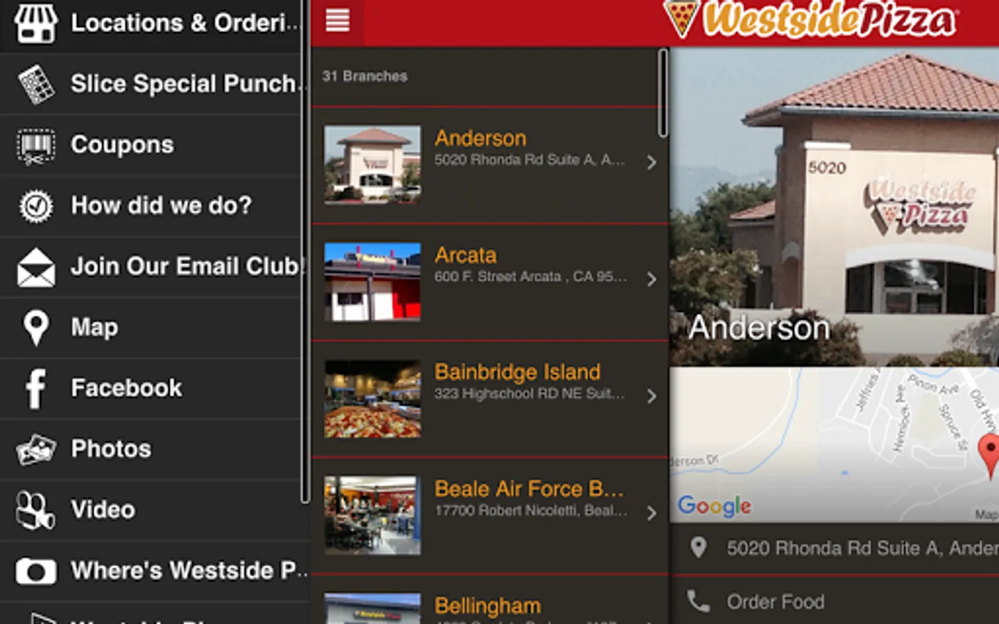 About Us, Coupons, Map, Events, News, Photos, Video, Facebook, Contact Us, Photos, Order Food, Map, Review