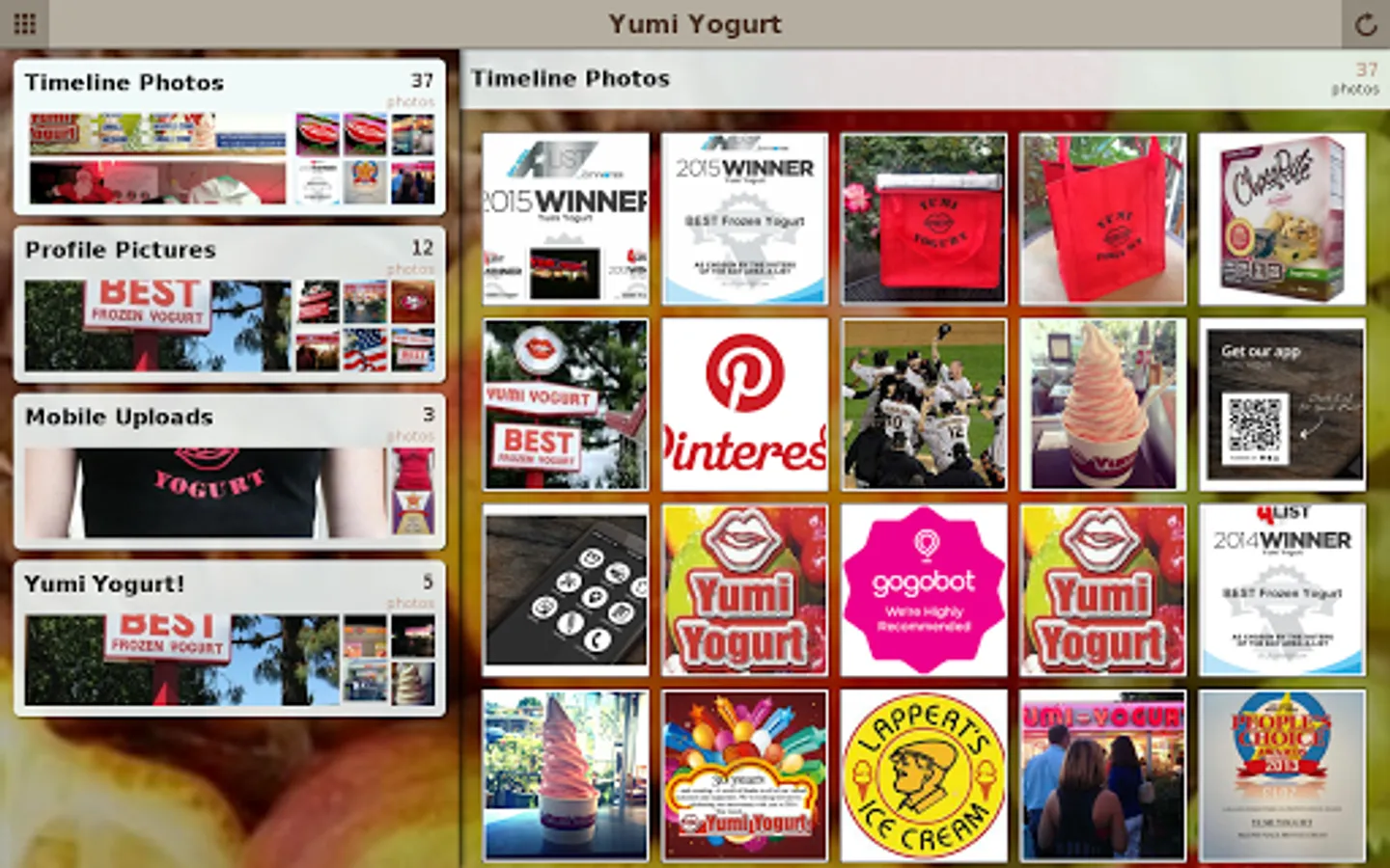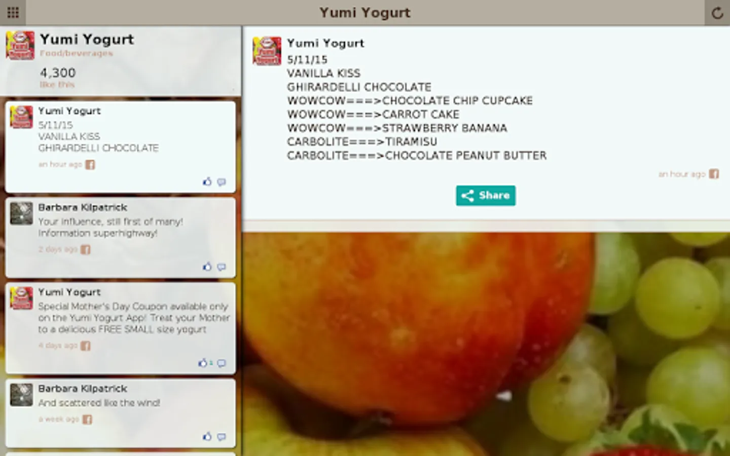 Welcome to the official Yumi Yogurt application! This app offers the quickest way to view our daily flavors at each of your favorite Yumi locations, weekly coupons and a loyalty card.