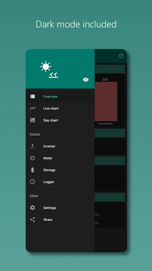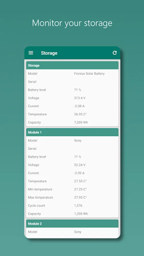 - Real time data about your energy use (Own consumption, Grid feed, Battery charge and Ohmpilot)