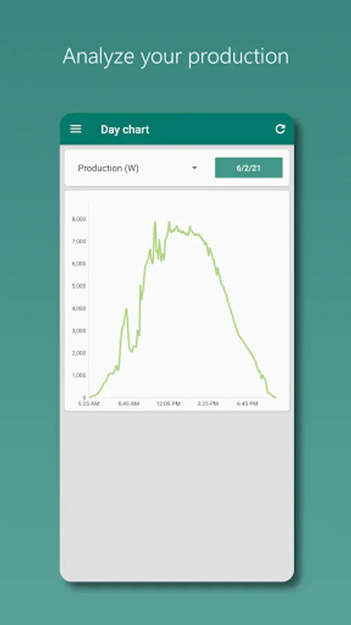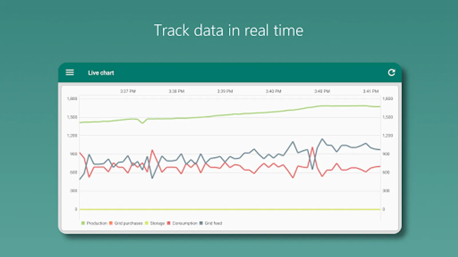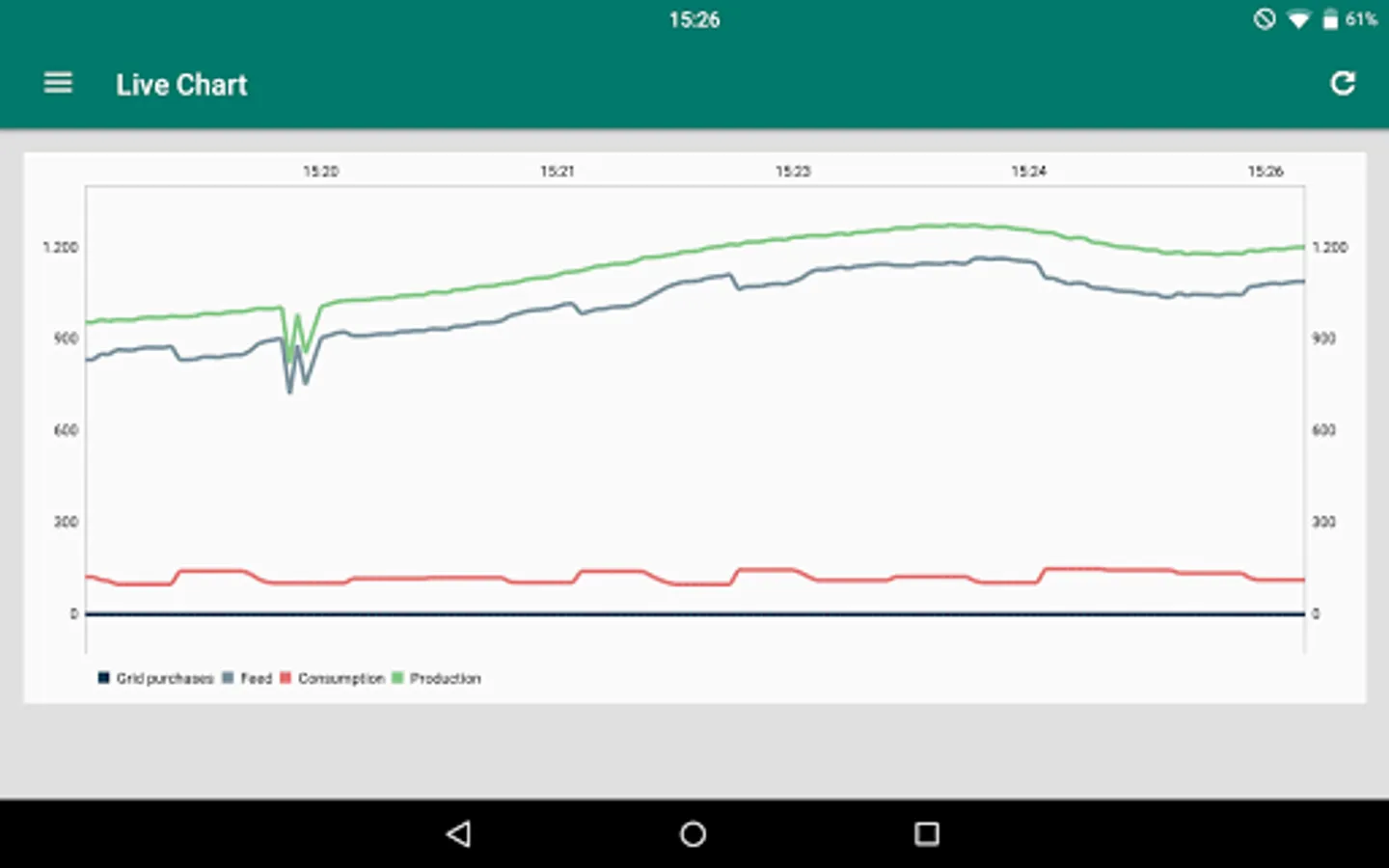 - Live chart of real time production, consumption, Grid feed and Grid purchases