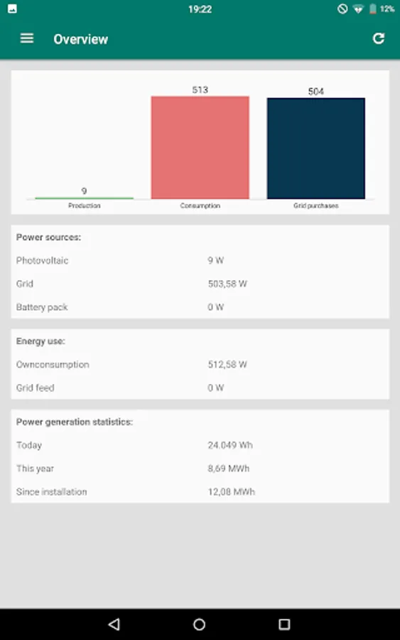 - Real time data about current power sources (Photovoltaic, Grid and Battery pack)