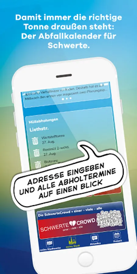 - Personalized Schwerter waste calendar with reminder function (via push message) and export function to the personal calendar